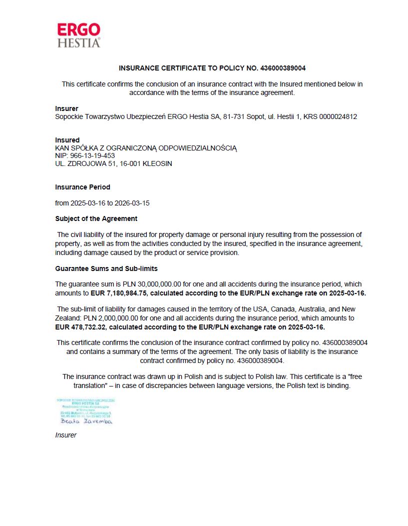 La société KAN est assurée pour un montant de 7.180.985 EUR pour couvrir toutes les éventuelles réclamations des clients qui pourraient découler des dispositions de garantie.